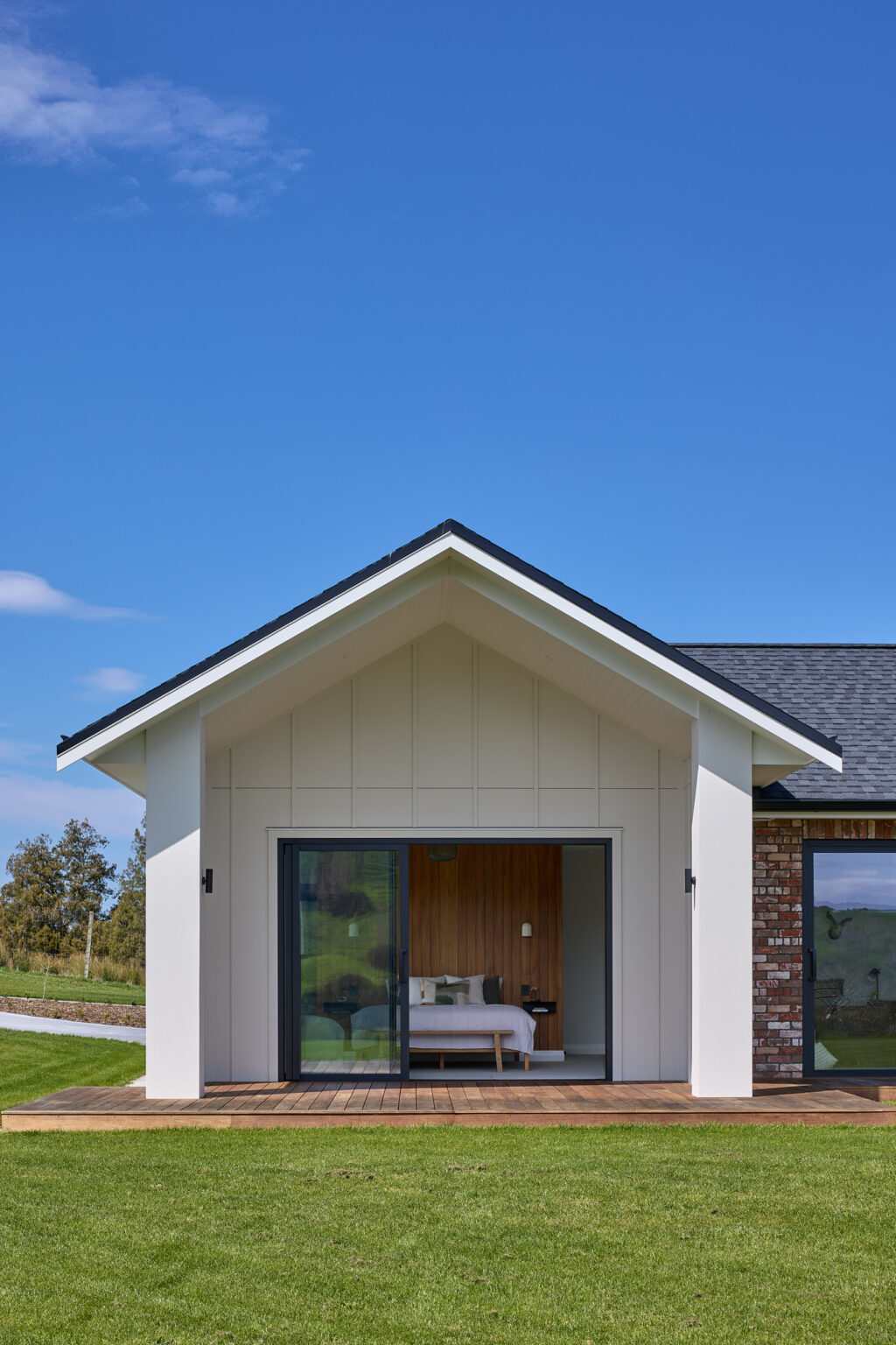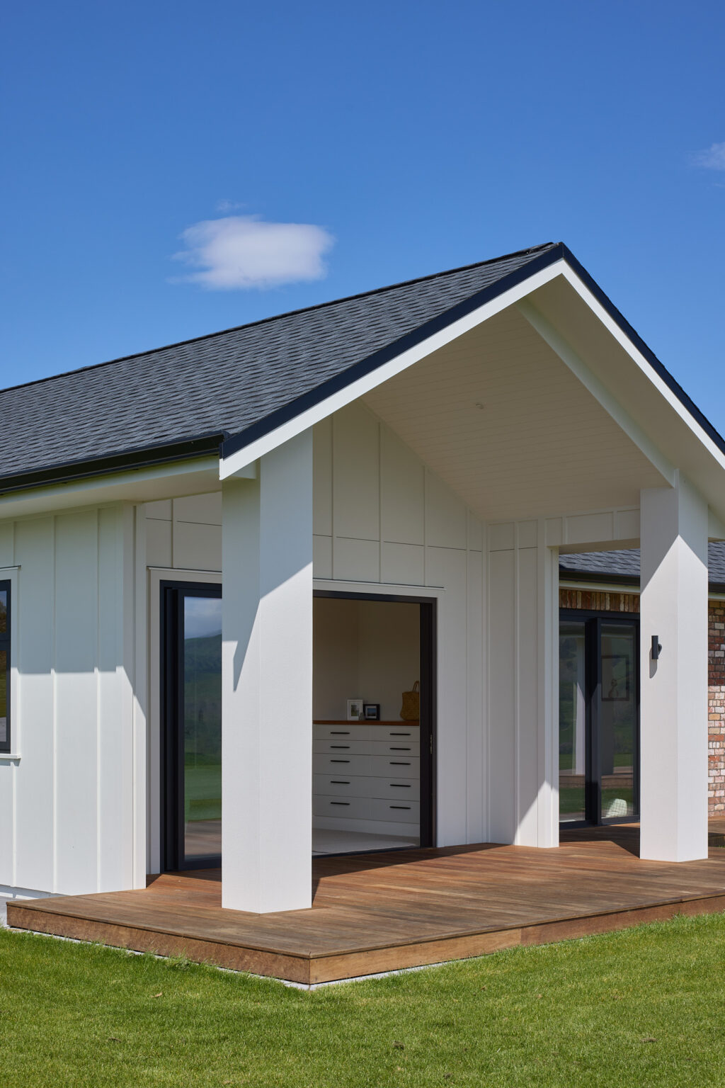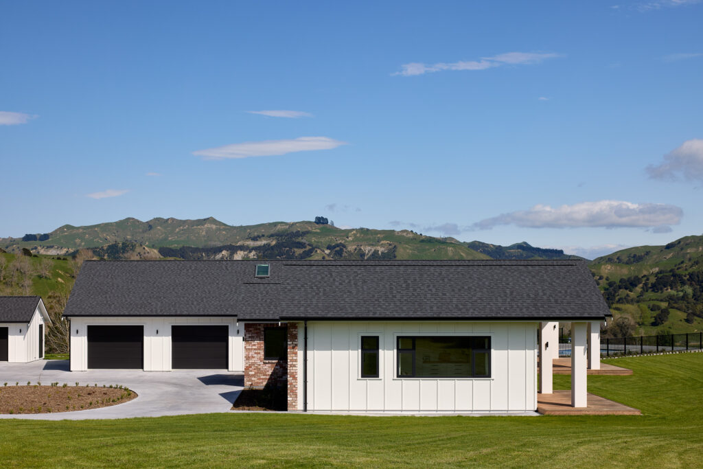 他们在住宅外立面采用了Axon™ Panel光滑型,搭配Hardie™ Axent™ 饰板,实现了常见于现代农舍的板条(board-and-batten)立面效果,并涂刷Resene的Milk White油漆。这样的搭配既呼应了传统农舍的垂直节奏,又在细节上显得干净、利落、现代。