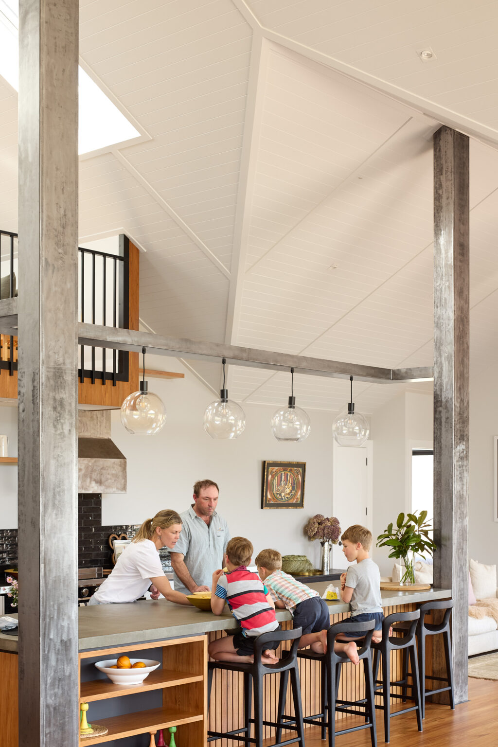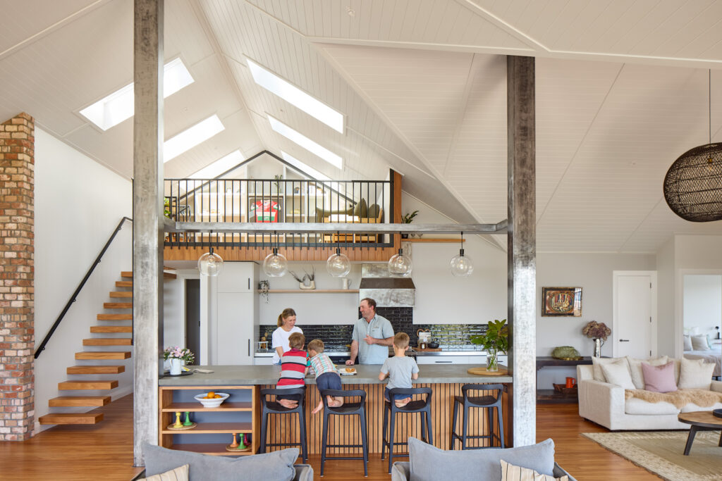 在室内,Hardie™ Groove内衬板被应用于开放式厨房、餐厅、客厅以及部分天花区域,为挑高空间增添了传统质感,同时保持了现代住宅所需的简洁与耐用。