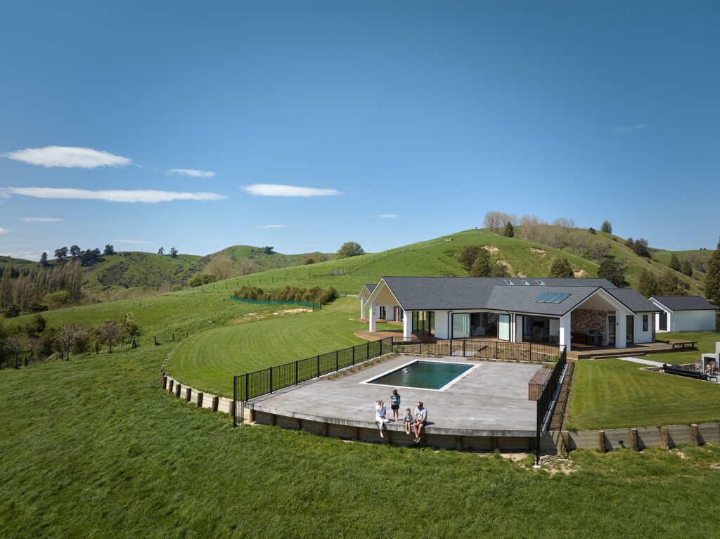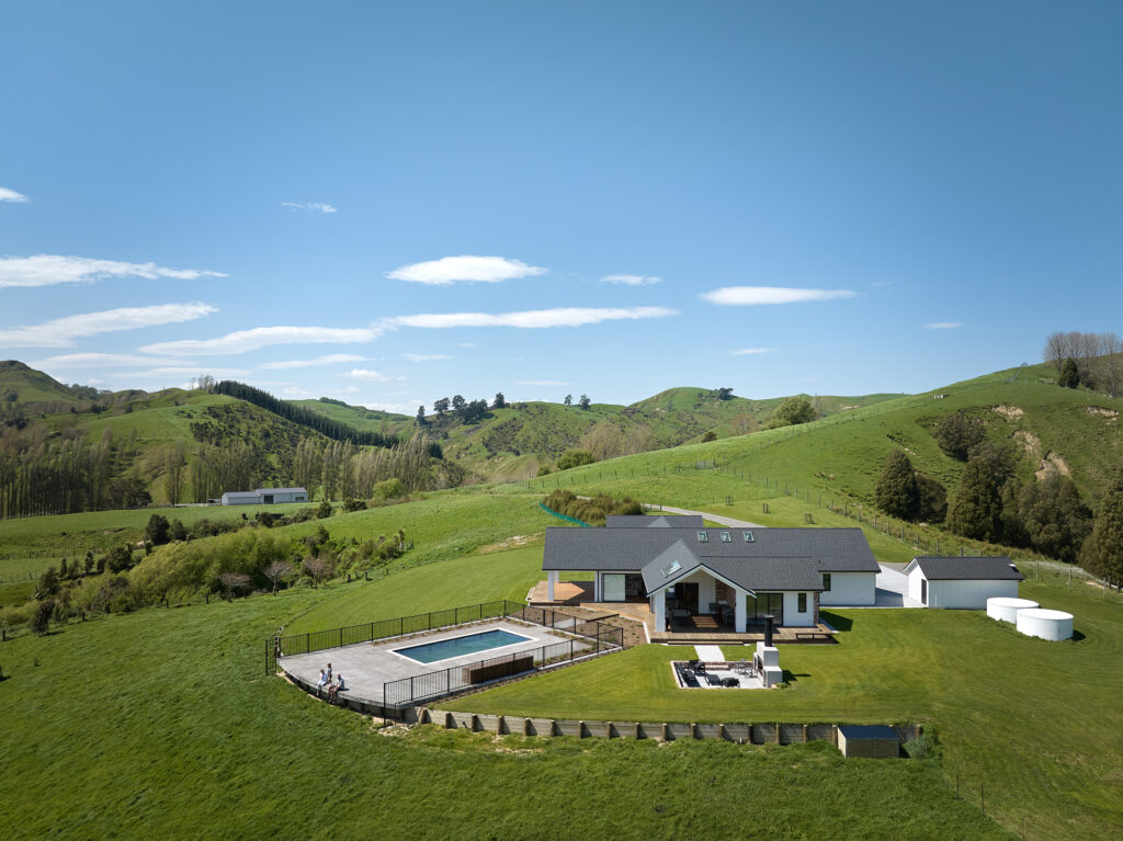 他们的五居室住宅坐落在吉斯伯恩一块阳光充沛的土地上,视野可俯瞰自家约80公顷的农场。这样的环境,决定了这座房子必须与自然紧密相连,因此在设计时,他们选择了经典而带有现代风格的现代农舍风。