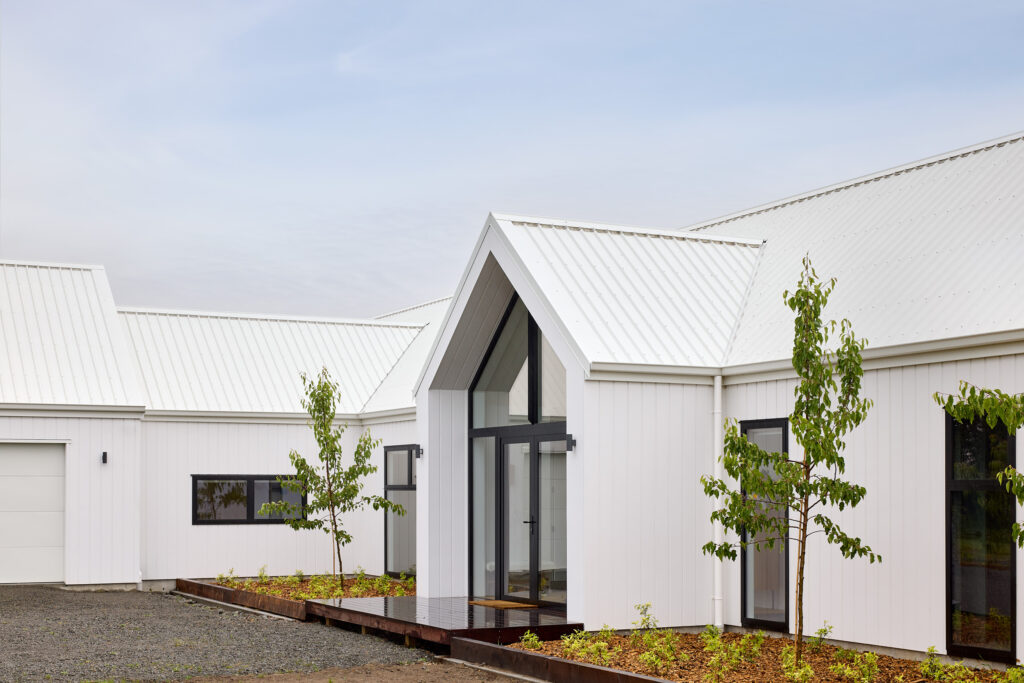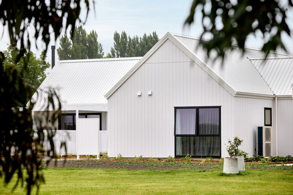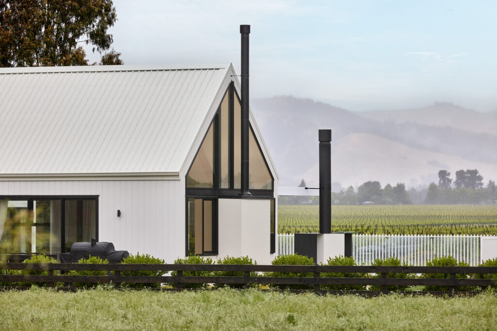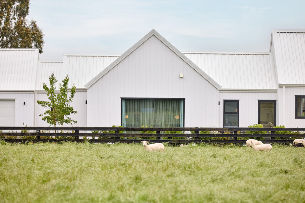 在建房这件事上,其实没有什么标准答案。在新西兰南岛Blenheim的乡间,一块可以远眺Wither Hills山丘与葡萄园的农庄上,Krista和Richard决定在这里建造一栋理想的房子。他们曾经非常确定自己想要什么——一栋深色调的现代谷仓风格住宅,与辽阔的自然形成对比,那几乎是他们心中已经定型的答案。直到与建房顾问的一次会面中,一张白色外墙板住宅的照片出现在他们面前,他们的想法就在那一刻改变了。