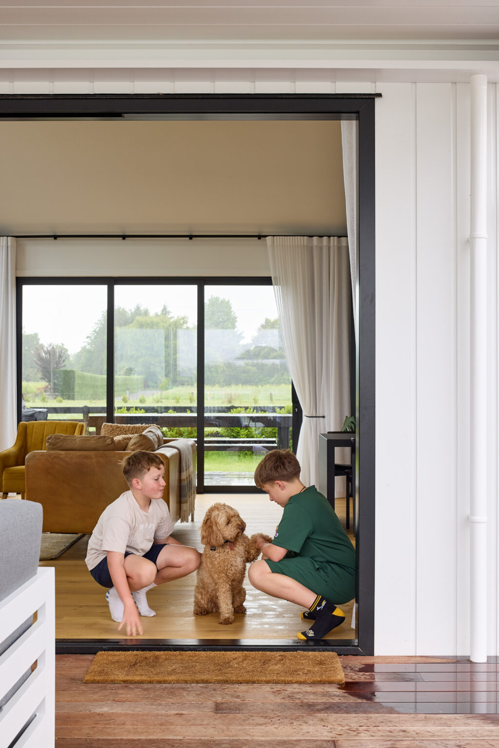 “在网上查阅了无数方案,也从James Hardie的案例图库中获得灵感后,我们决定采用刷有Resene Wan White的Oblique™ 护墙板。它干净的垂直线条让房子更具现代感,同时增强了整体的高度感与平衡感,与我们横向延展的建筑比例非常匹配。既保留了现代谷仓的气质,又呈现出更明亮、精致的风格。”